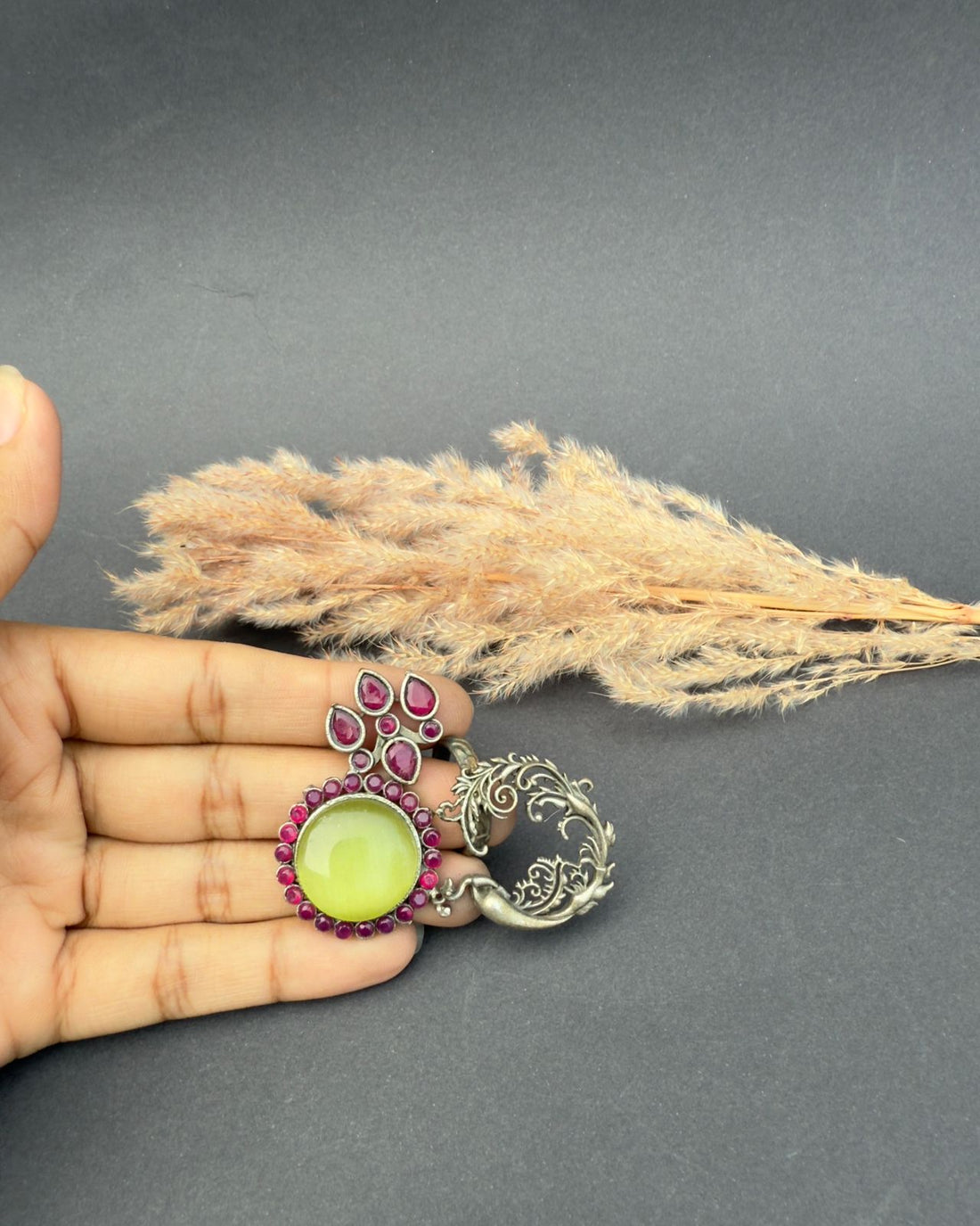 This artistic ring with stone work totaly handmade with premium quality brass silver oxidized plated...