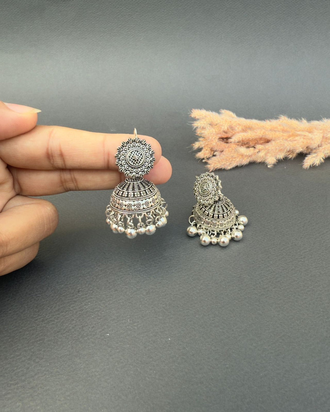 Elevate your look with these Silver Oxidized Jhumki Earrings – a perfect mix of tradition...