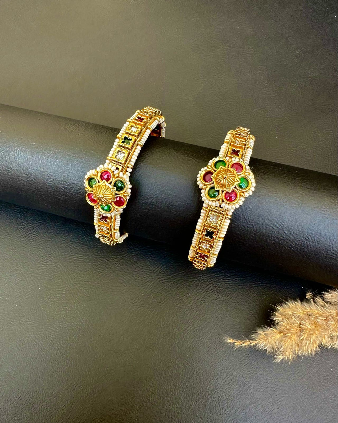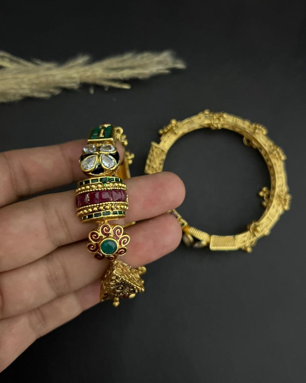 Rajhvari jewelry is basically a Rajasthani traditional jewelry, mostly worn by brides, its been made with brass and copper mixture gold plated with specially boasts of multi colored gems and pearls work known as the ‘aad’ which is unique to Rajasthani culture, and has recently captured the imagination of contemporary brides from different cultures.