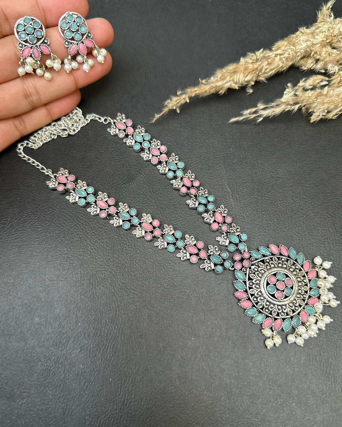 - Premium silver oxidized set- Necklace & earrings- Handmade Jewelry with stones little bit variation in...