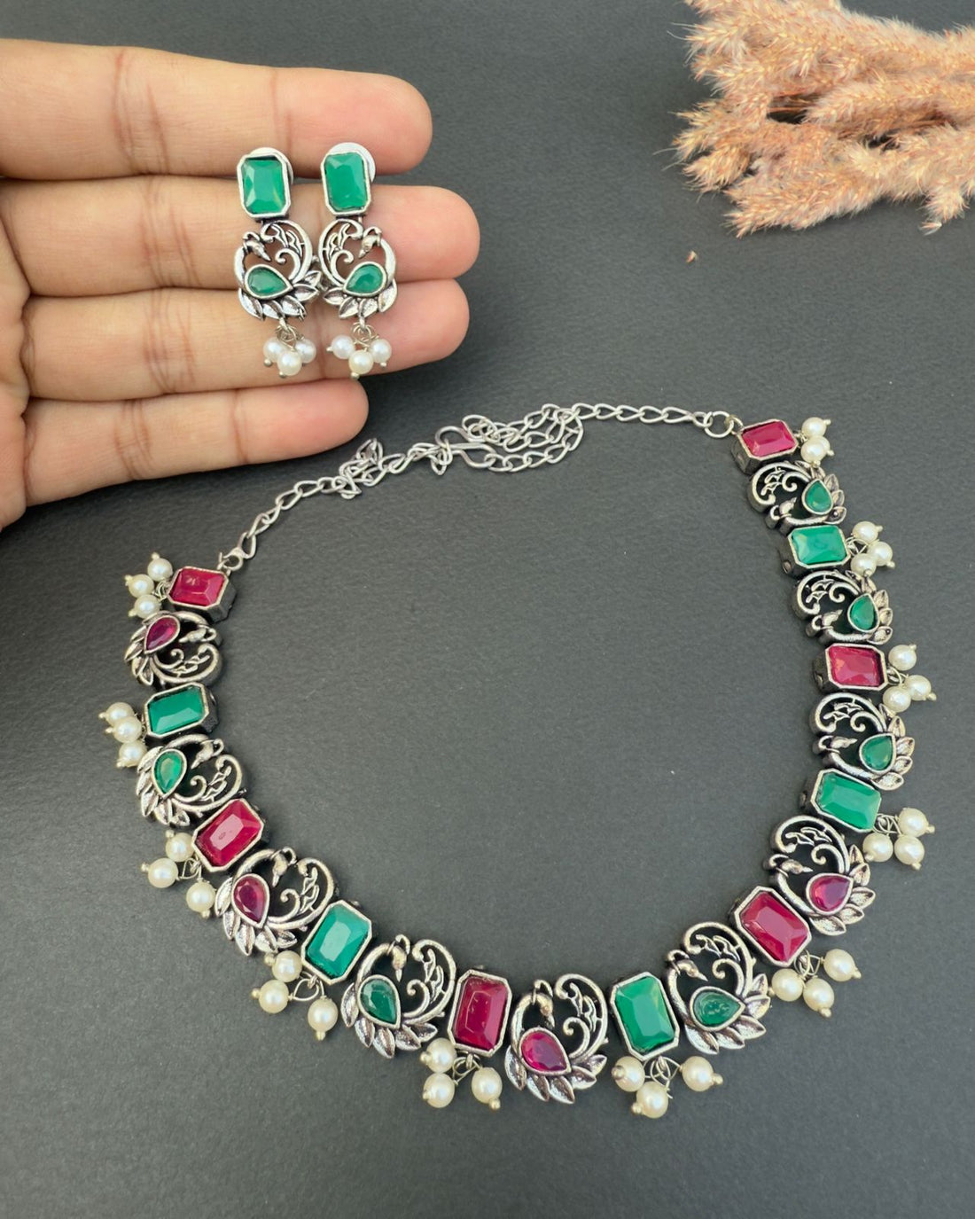 - Premium silver oxidized set- Necklace & earrings- Handmade Jewelry with  stones & pearls little bit...