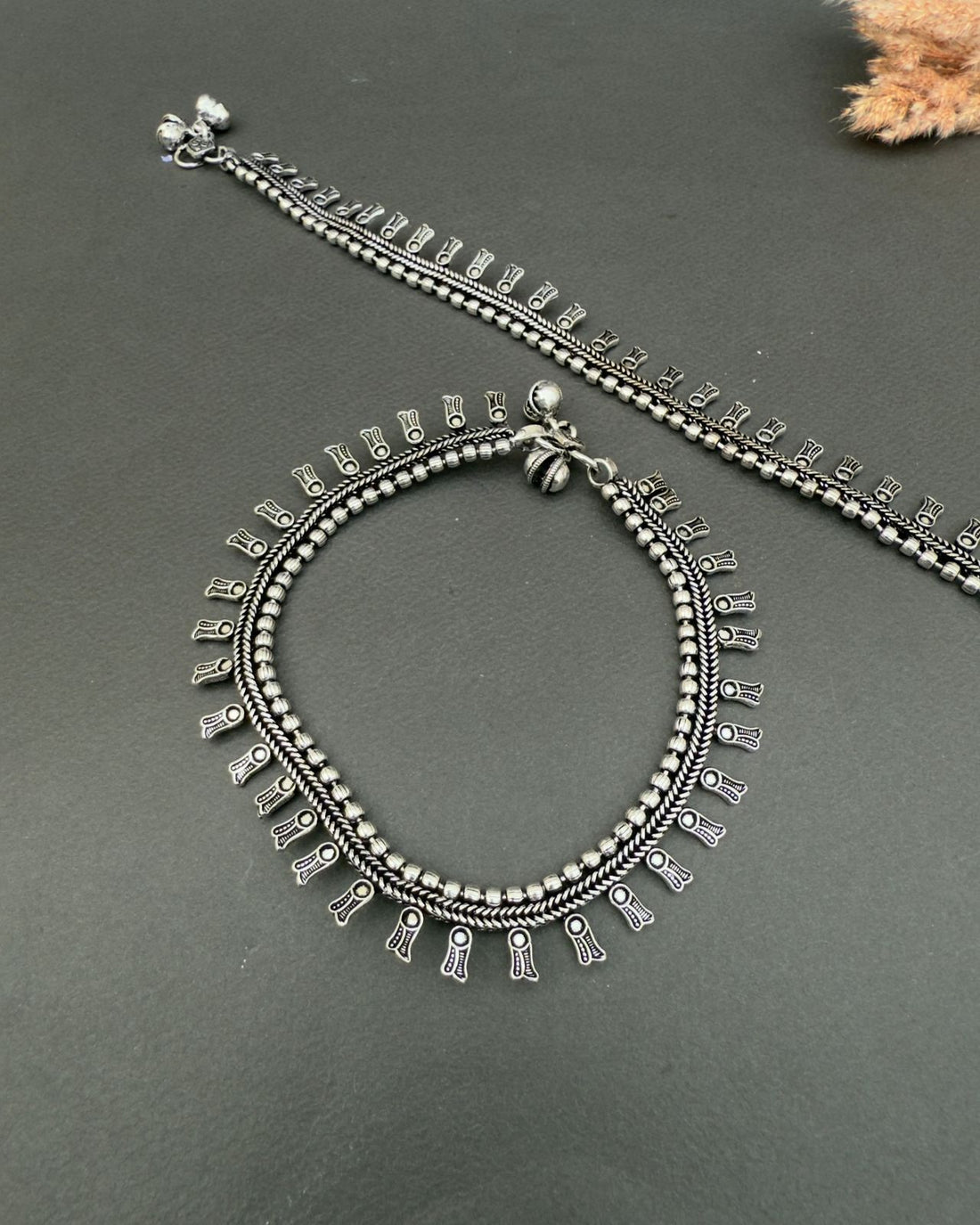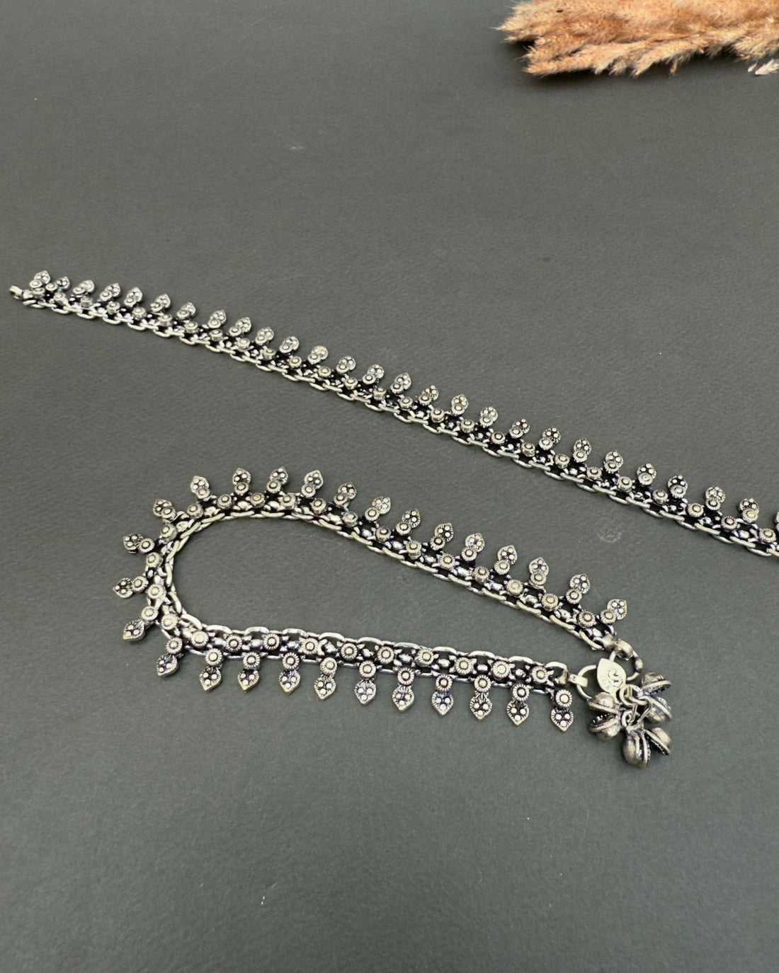 Enhance your style with our elegant oxidised silver anklets – designed to look like traditional...