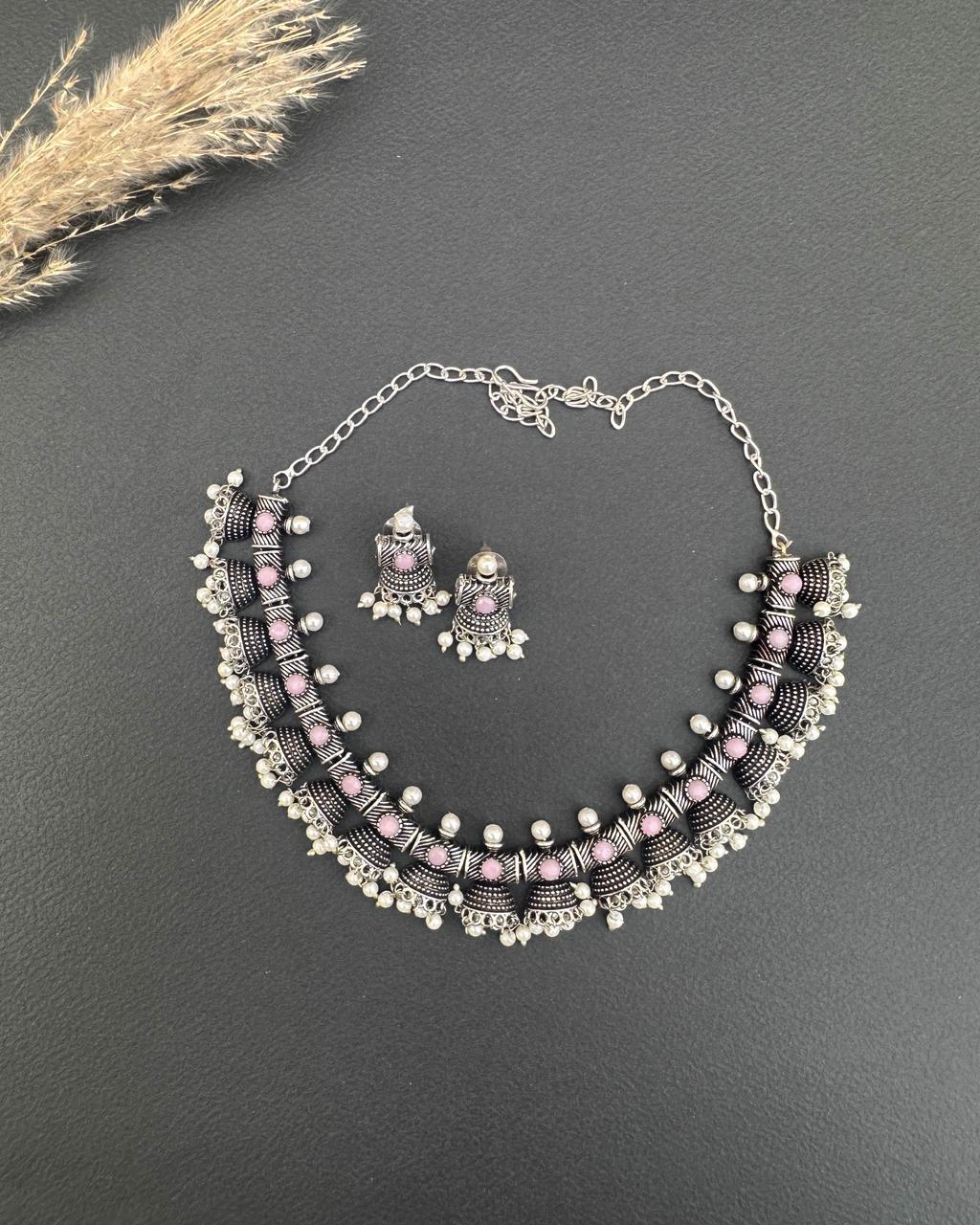 - Premium silver oxidized mala set - Stone Work - indian handmade antique jewellry