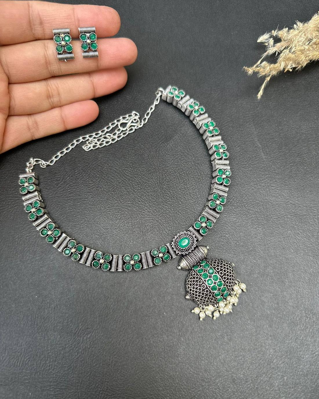 - Premium silver oxidized set- Necklace & earrings- Handmade Jewelry with stones little bit variation in...