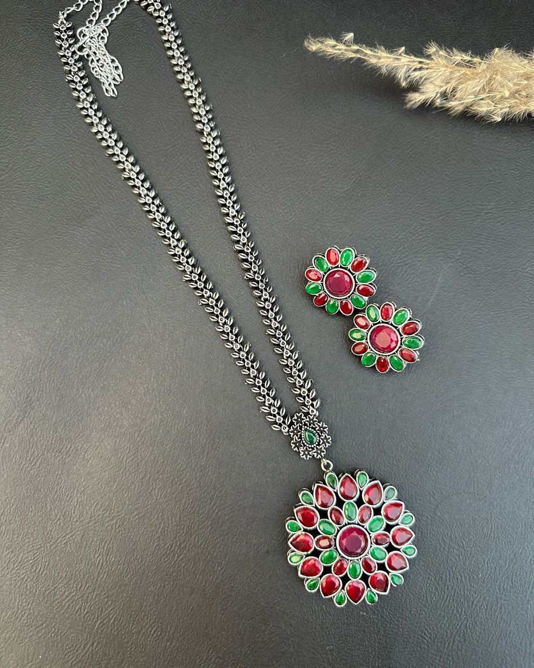 - Premium silver oxidized set- Necklace & earrings- Handmade Jewelry with stones little bit variation in...