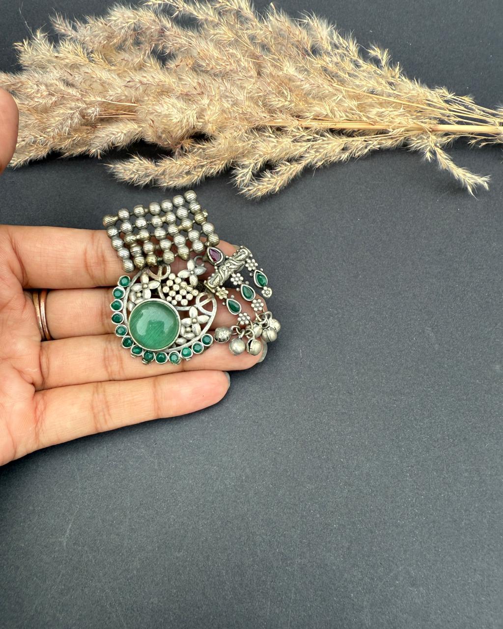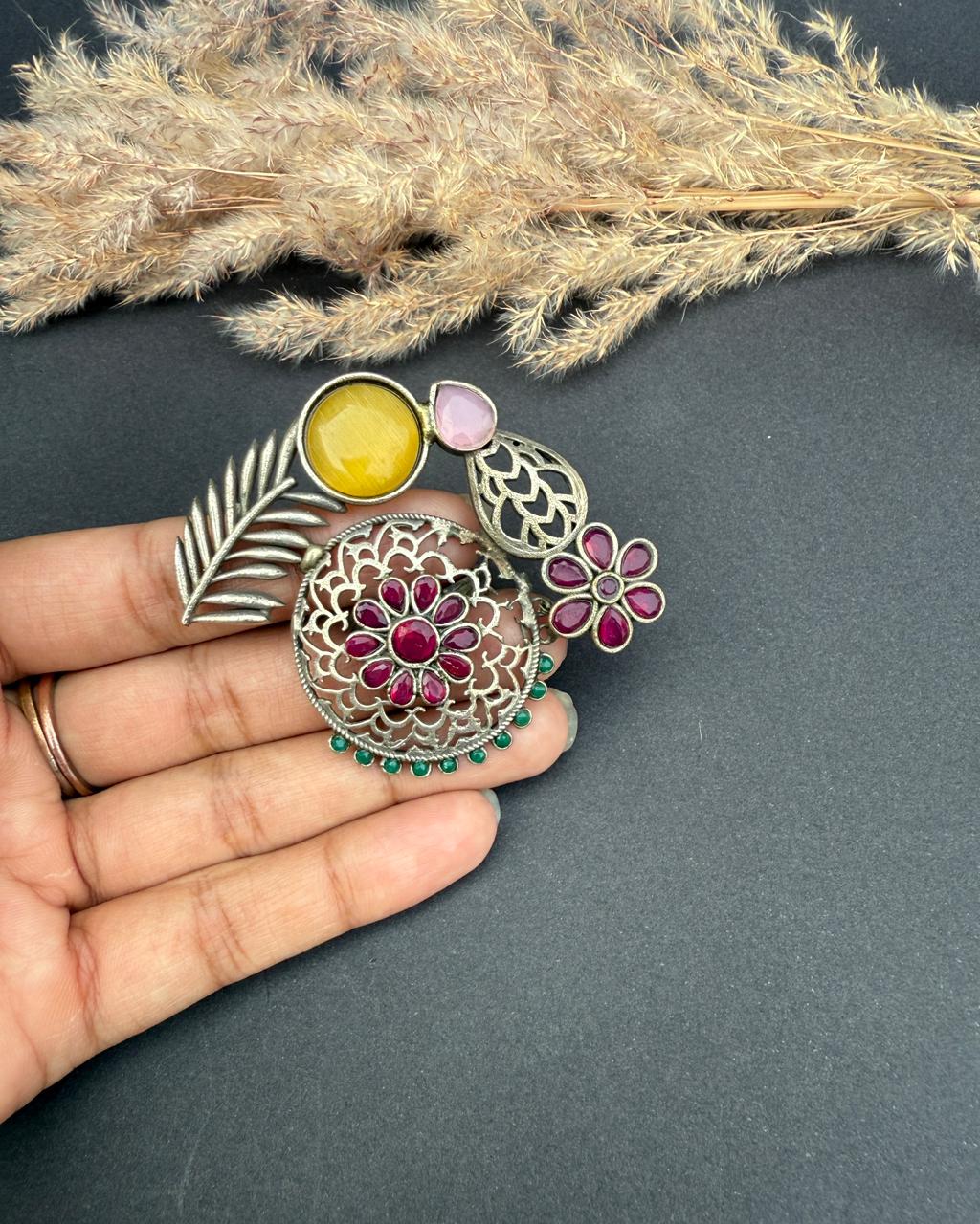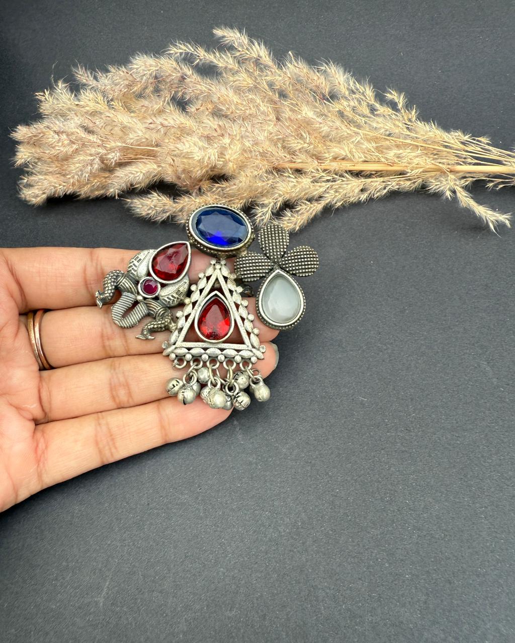 This artistic ring with stone work totaly handmade with premium quality brass silver oxidized plated...