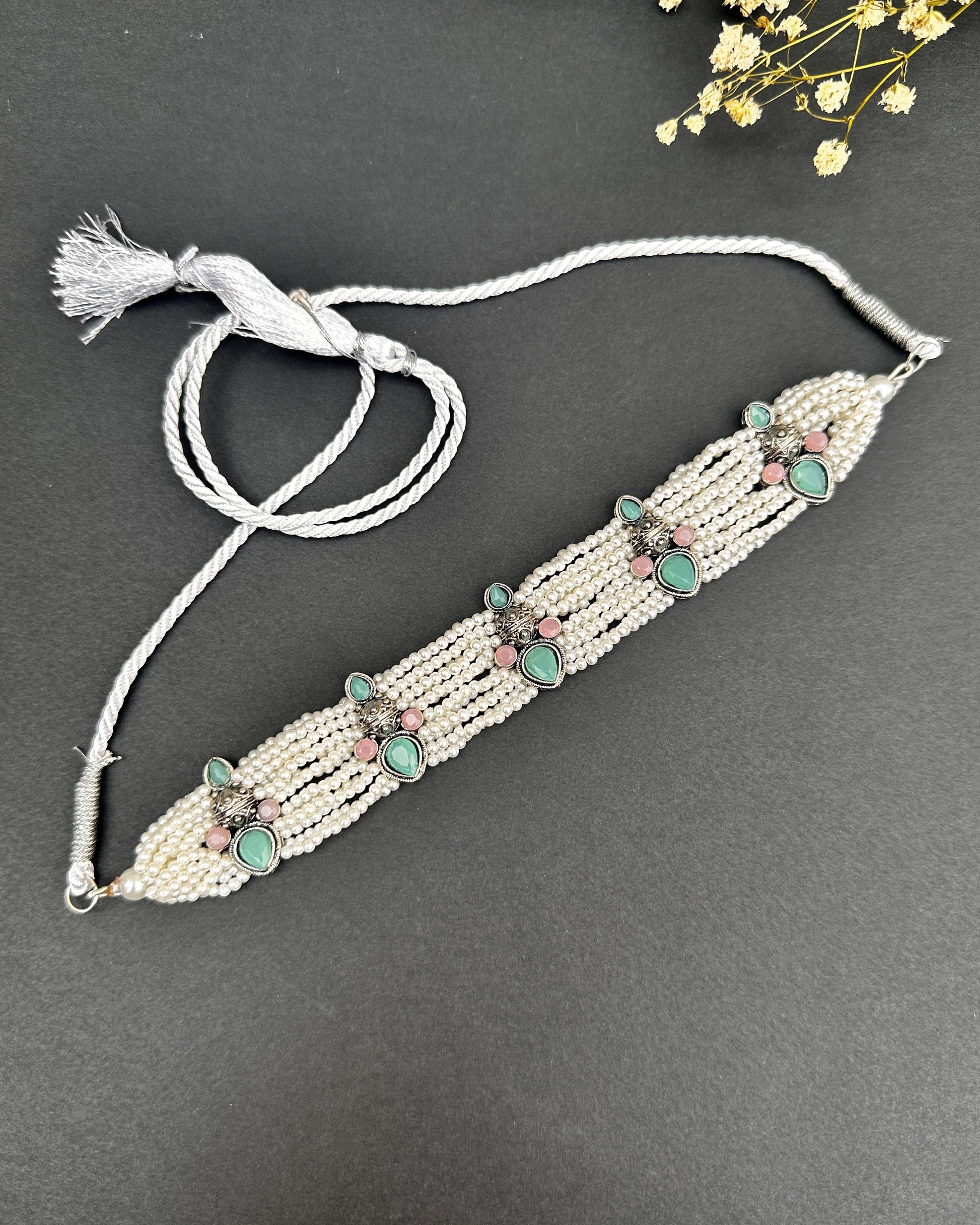- 18K Silver Plated Handmade choker made in an antique style with a combination of stones & pearls to enhance its look.