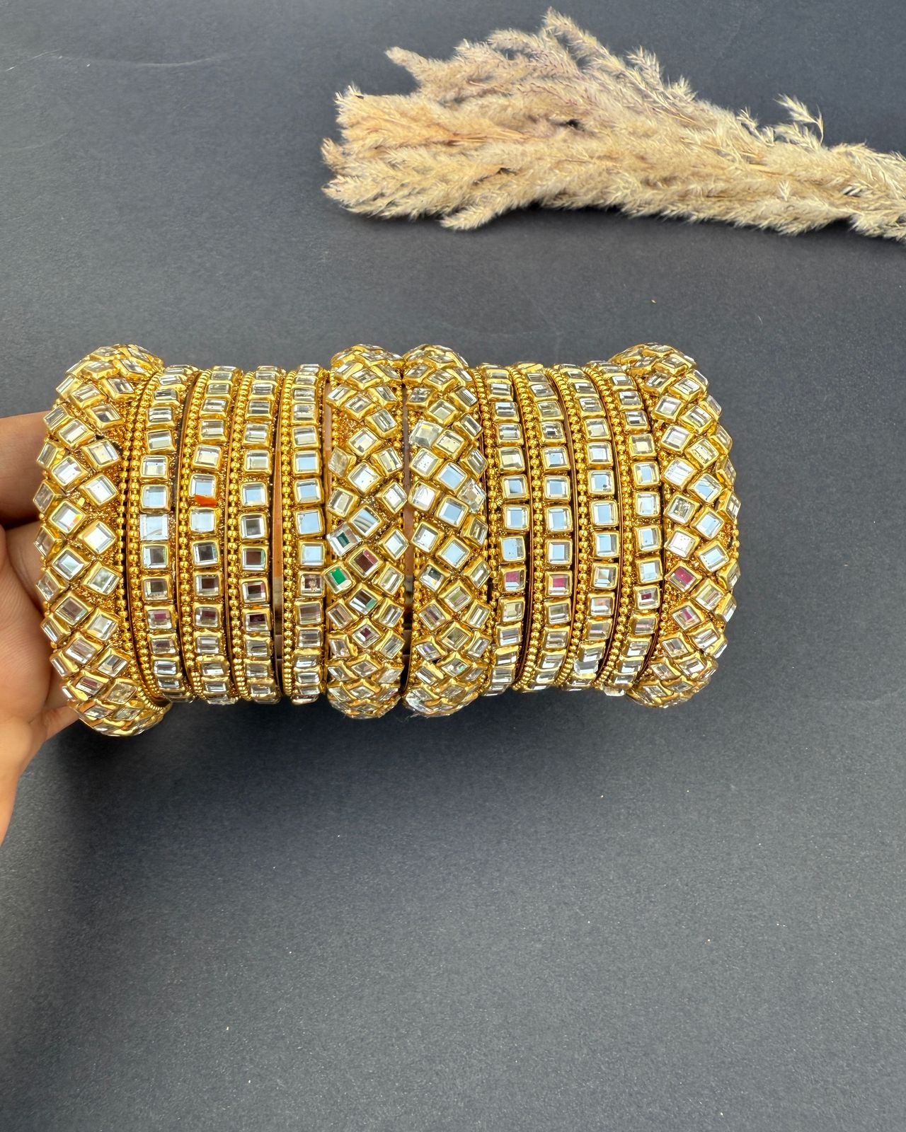 Enhance your festive look with this Gajra Style Kundan Bangles Set, featuring polki Kundan stones and floral-inspired detailing. Perfect for mehndi, mayoon, nikkah, and barat, these handcrafted bangles add a regal touch to any traditional outfit. Lightweight, elegant, and available in multiple sizes—shop now for timeless desi charm!