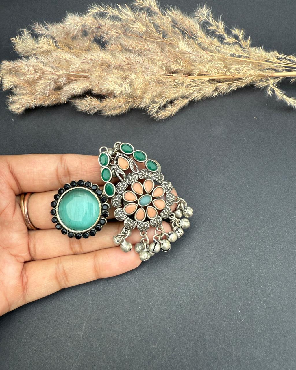 This artistic ring with stone work totaly handmade with premium quality brass silver oxidized plated as its handmade so a little human touch would be visible.