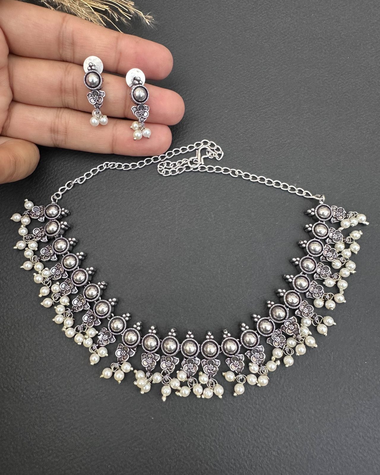 Premium silver oxidized necklace set with stones & pearls.