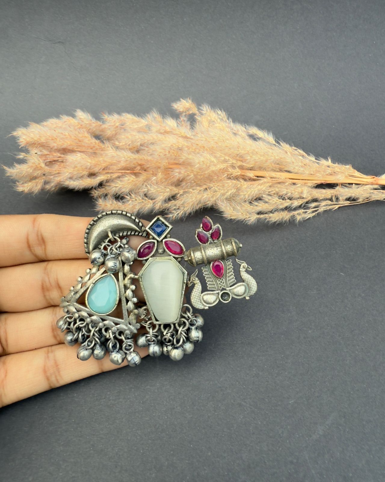 This artistic ring with stone work totaly handmade with premium quality brass silver oxidized plated as its handmade so a little human touch would be visible.