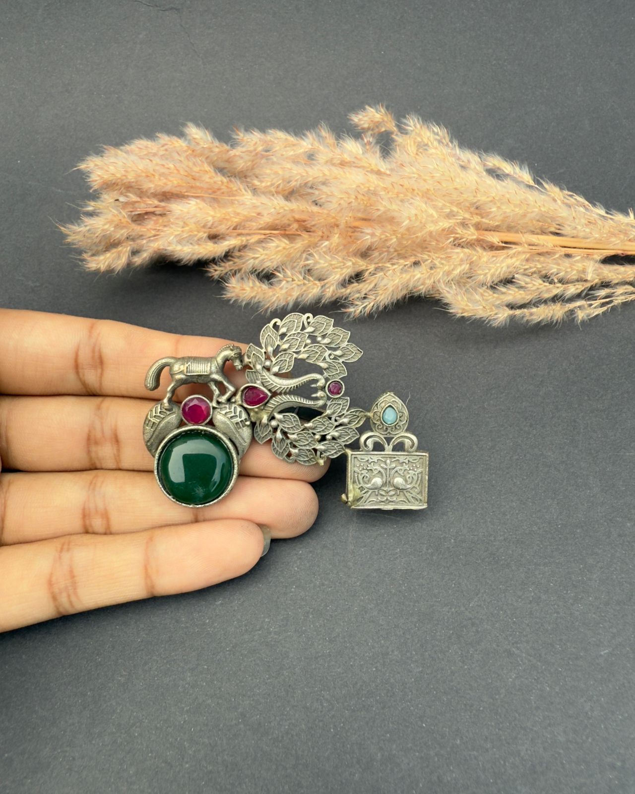 This artistic ring with stone work totaly handmade with premium quality brass silver oxidized plated as its handmade so a little human touch would be visible.