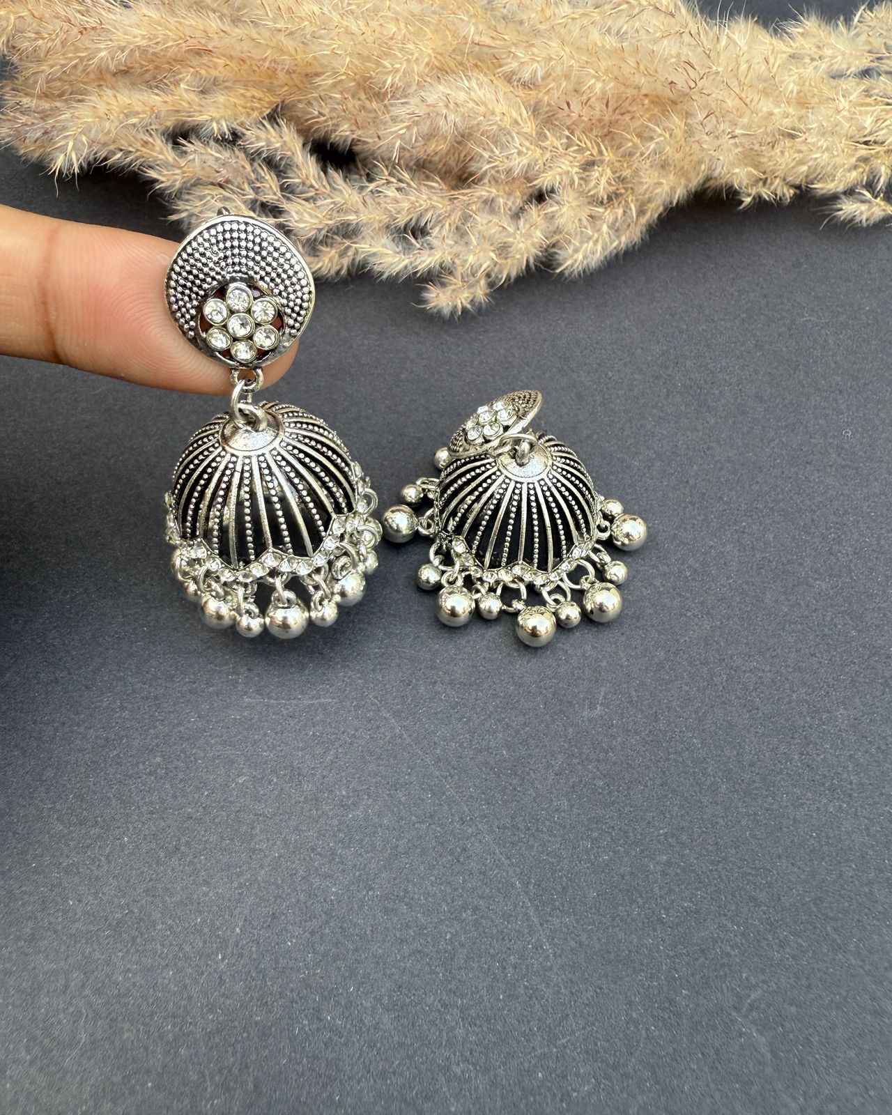 Elevate your look with these Silver Oxidized Jhumki Earrings – a perfect mix of tradition and trend. Lightweight and intricately designed, they're ideal for casual wear, festive looks, or mehndi events. A must-have in traditional Pakistani jewellery.
