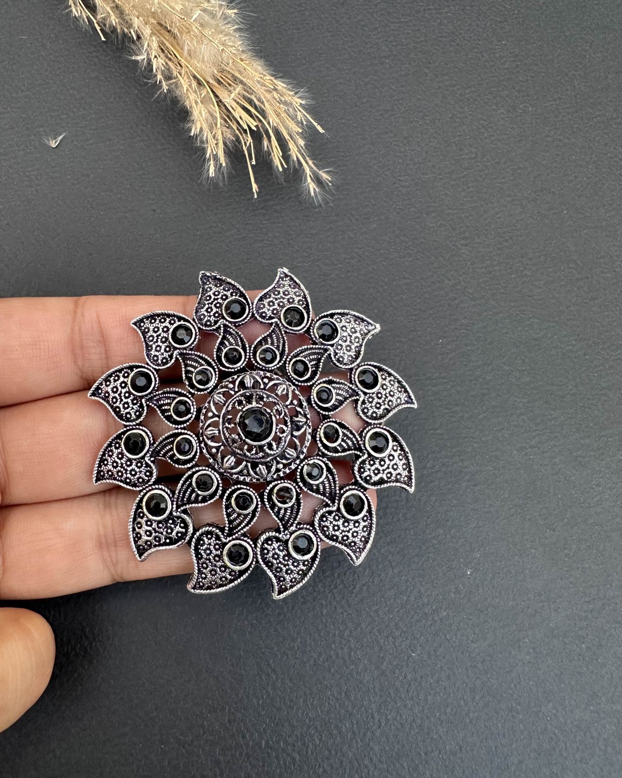 This artistic ring with stone work totaly handmade with premium quality brass silver oxidized plated as its handmade so a little human touch would be visible.