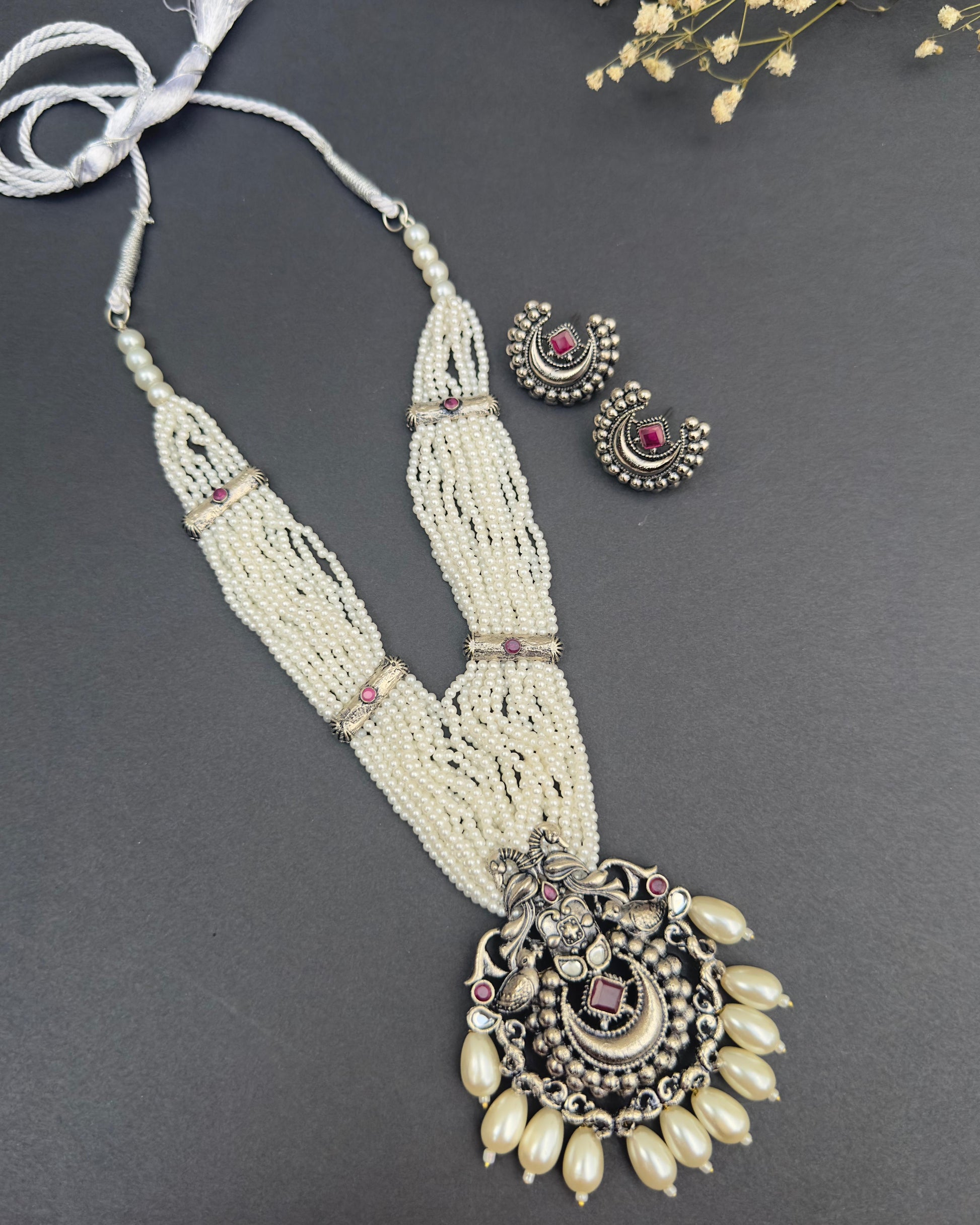 - 18K Silver Plated Handmade Mala Set made in an antique style with a combination of stones & pearls to enhance its look.